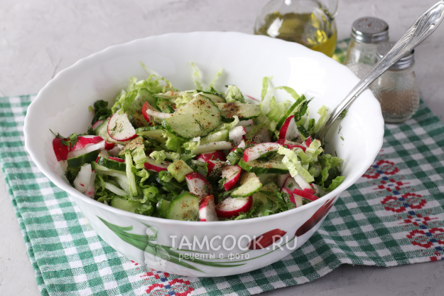 Подать вкусный салат из пекинской капусты с огурцом и редиской к столу.