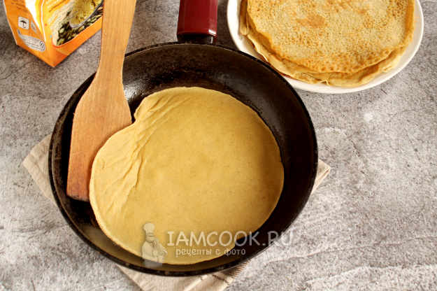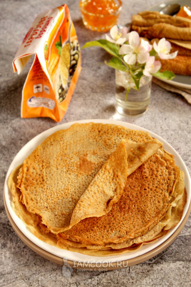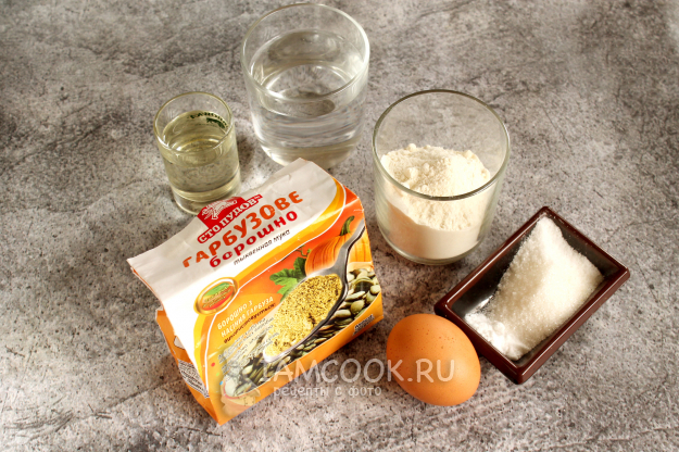 Продукты для блинов из тыквенной муки подготовьте по списку. Воду можно заменить молоком. Если тесто замешивают гуще, на кефире или другом кисломолочном напитке, выпекают оладьи, толстые блины, панкейки.