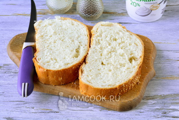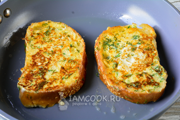 Разогрейте масло на сковороде, включив небольшой огонь. Выложите батон и обжаривайте 1-2 минутки.