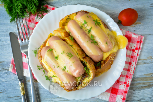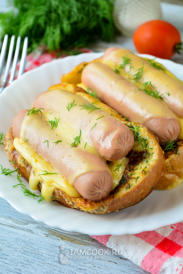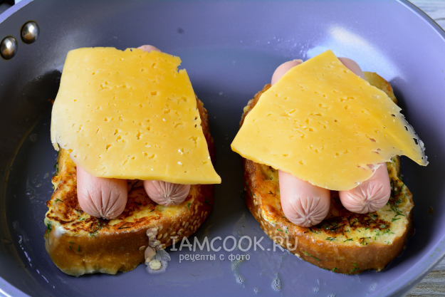 И сразу после переворачивания выложите на бутерброды почищенные молочные сосиски. На 1 бутерброд - по 2 сосиски.