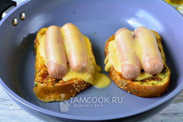 И жарьте бутерброды под крышкой еще пару минут, пока сыр не расплавится и сосиски полностью не зафиксируются на хлебе и не будут выпадать. Как раз и нижняя сторона хлеба дожарится.