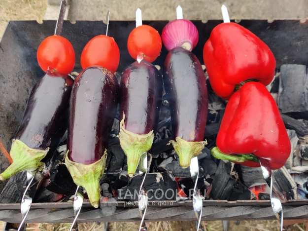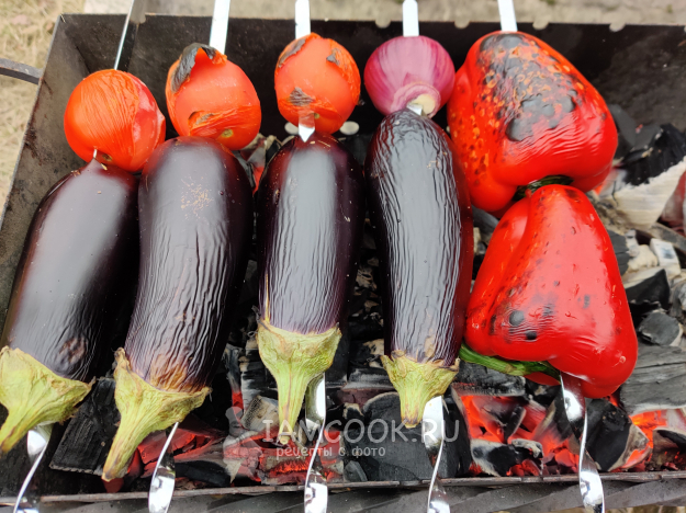 Готовьте овощи над углями при умеренном жаре примерно 10-15 минут, периодически переворачивая шампуры. Кожица у овощей должна хорошо обуглиться (до черноты).