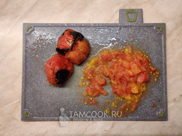 Как только кожица у томатов обуглилась и лопнула, их можно снимать с шампуров. Дайте помидорам немного остыть, а затем очистите их и мелко нарежьте.