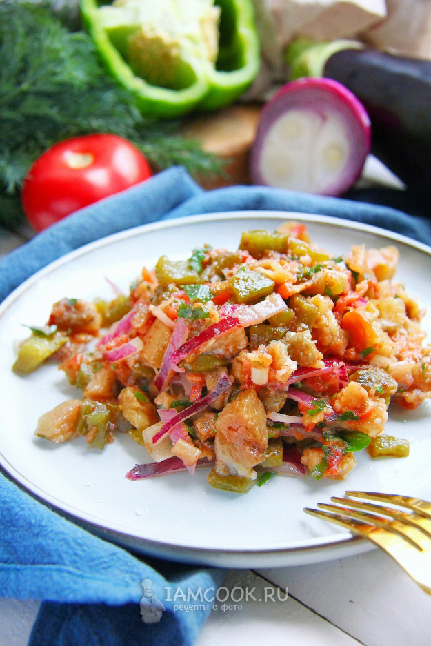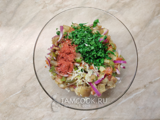Соедините овощи в глубокой миске, добавьте мелко нарезанный красный лук и чеснок, натертый на мелкой тёрке. Добавьте нарезанную зелень кинзы и сушёную аджику.