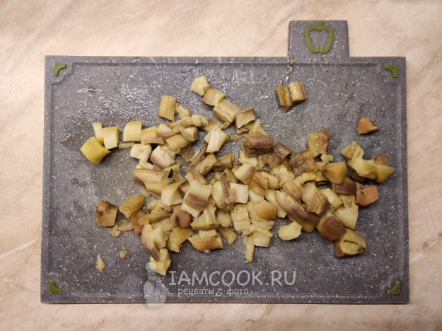 Готовые баклажаны разрежьте вдоль и, удалив стопку, отделите мякоть от обугленной кожицы. Так же поступите и с паприкой. Измельчите овощи.