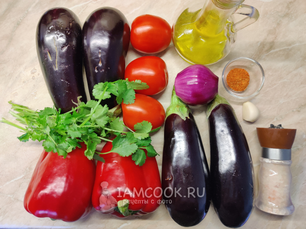 Чтобы приготовить классический аджапсандал на мангале, подготовьте все необходимые ингредиенты. Овощи тщательно вымойте под проточной водой. Лук и чеснок очистите.