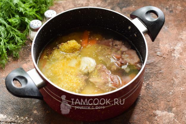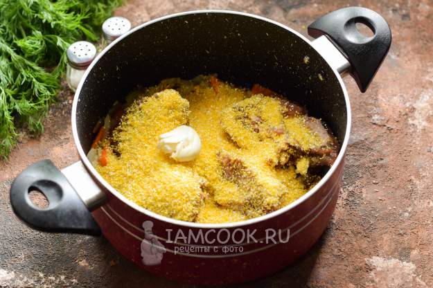 Всыпать в кастрюлю кукурузную крупу, добавить раздавленный зубчик чеснока.