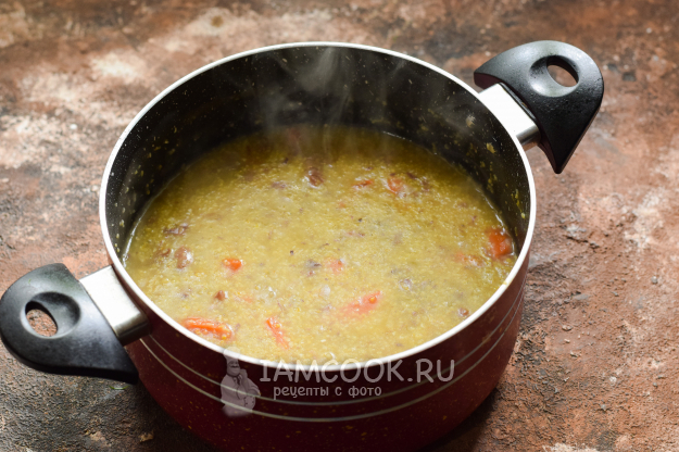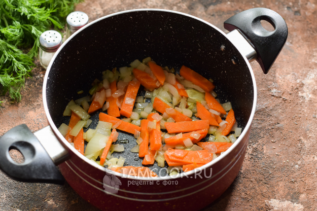 Прогреть кастрюлю на среднем огне, после влить масло и выложить лук, морковь. Жарить овощи несколько минут, помешивая.