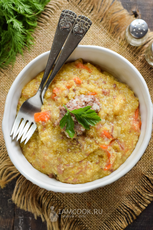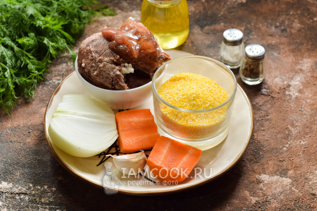 Возьмите все продукты для приготовления кукурузной каши с тушенкой по списку.