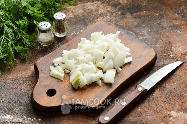 Очистить репчатый лук, ополоснуть и просушить. Нарезать лук небольшими кубиками.