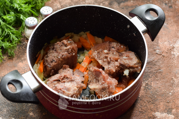 Теперь выложить к овощам тушенку. Можно использовать любую тушенку, у меня была говяжья, но подойдет куриная, свиная.