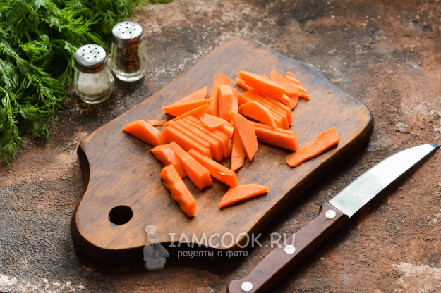Морковь почистить, ополоснуть и просушить. Нарезать полосками или брусочками, также можно натереть морковь на терке.