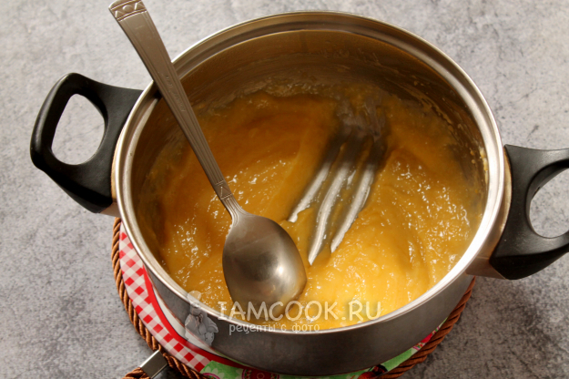 Непрерывно взбивайте венчиком и прогревайте на умеренном огне. Не дайте подгореть, как если бы заваривали кисель или заварной крем.