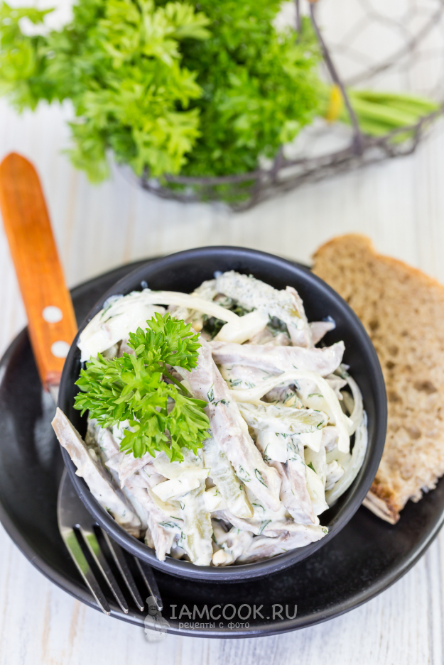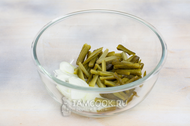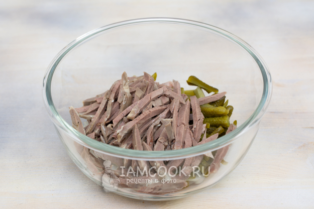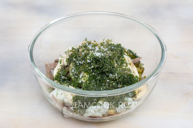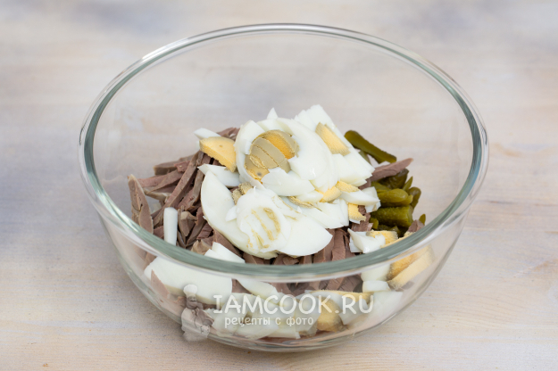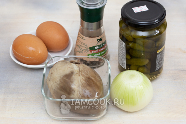 Для приготовления салата с сердцем, маринованными огурцами и яйцом подготовьте продукты по списку.