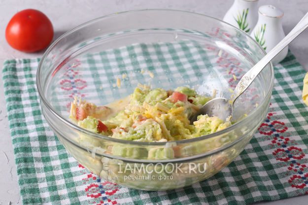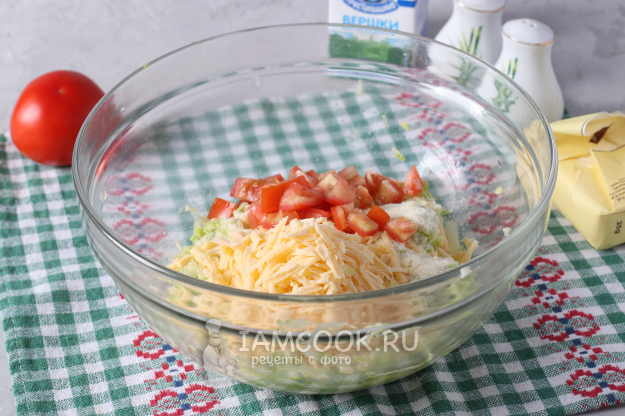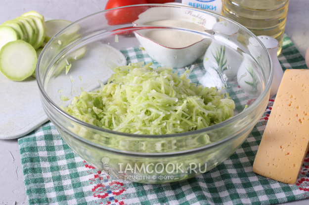 За это время натираем на тёрке сыр, один помидор нарезаем кубиками. Спустя 15 минут сливаем с кабачков выделившийся сок и ещё немного их отжимаем. Добавляем в кабачковую массу манку, помидор и половину тёртого сыра.