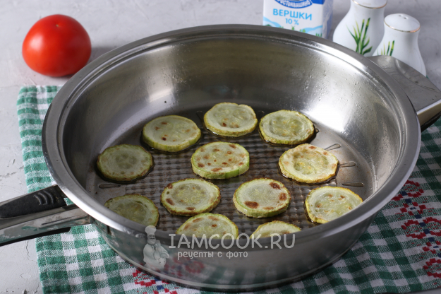 В сковороде разогреваем постное масло и обжариваем нарезанные кружочки кабачка с двух сторон.