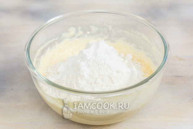Добавьте муку, смешанную с разрыхлителем.