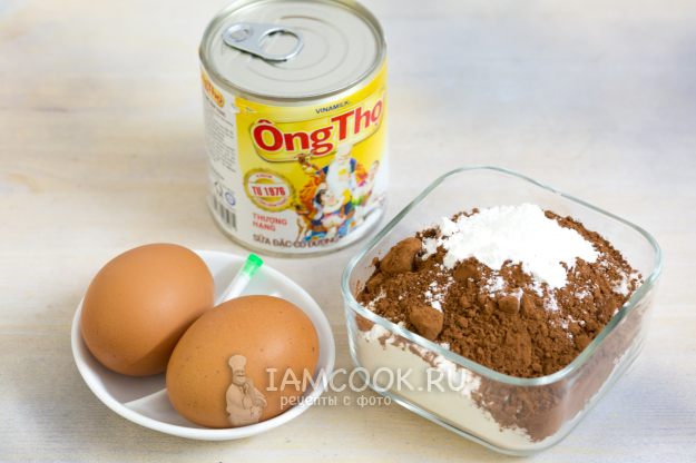 Для приготовления шоколадного бисквита на сгущенке подготовьте продукты по списку.