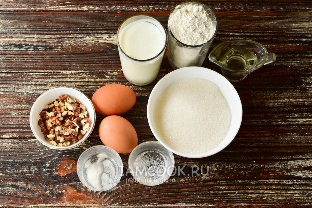 Подготовьте все необходимые ингредиенты для пирога «Кудряш» с грецкими орехами.