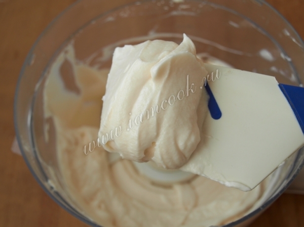 Увеличить скорость и продолжать взбивать, пока масса не начнёт уплотняться. Если вы используете сметану жирностью менее 30%, то в этот момент добавьте загуститель и продолжайте взбивать до уплотнения массы (консистенцию можно увидеть на фото ниже - на лопатке).