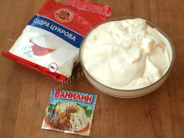 Итак, возьмём сметану, сахарную пудру и ванилин. Сахарную пудру, конечно же, можно заменить сахаром, но тогда время взбивания крема увеличится в 2-3 раза.