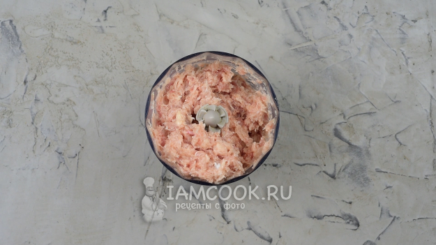 Кусочки филе выложим в чашу стационарного блендера и переработаем все в фарш.