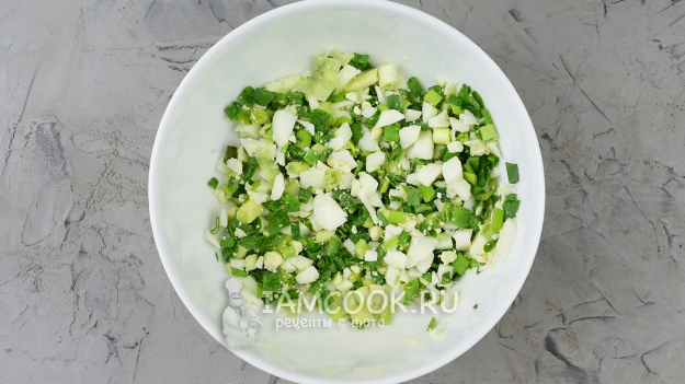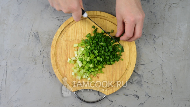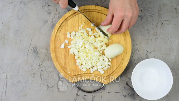 В миске соединим измельченные яйца и лук, добавим 1/2 ч.л. соли. Перемешаем.