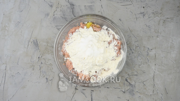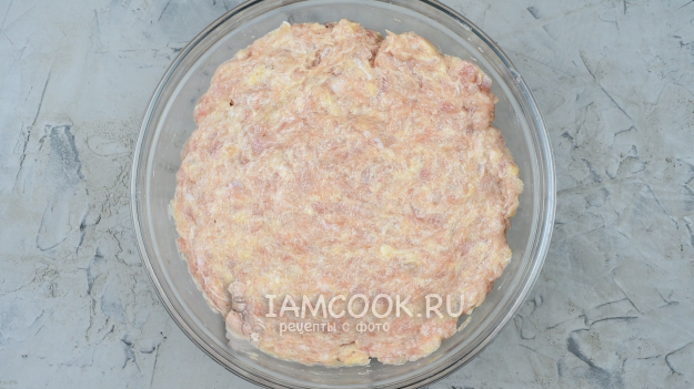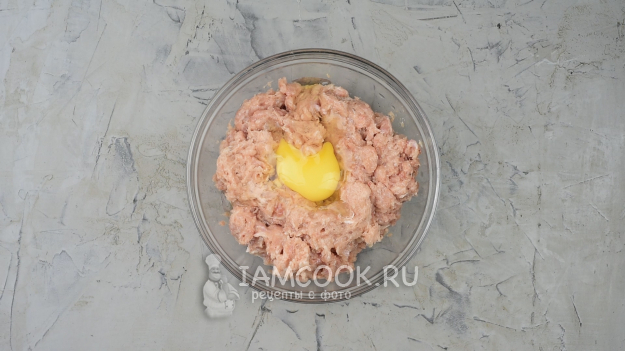 Куриный фарш выложим в просторную миску и туда же вобьем одно яйцо.