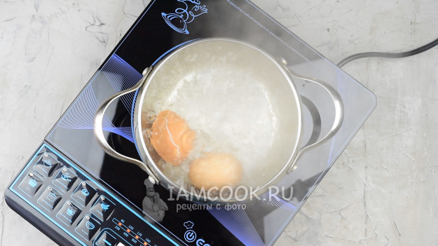 Отварим два яйца вкрутую, немного охладим их и освободим от скорлупы.