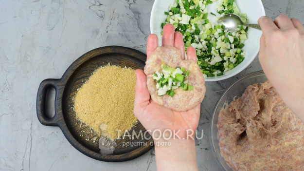 Сформируем заготовки зраз. Отделим от общей массы фарша небольшую часть, расплющим в блин на ладони, на середину выложим одну-две чайные ложки яично-луковой смеси. Края фарша поднимем и скрепим так, чтобы начинка оказалась надежно спрятана внутри.