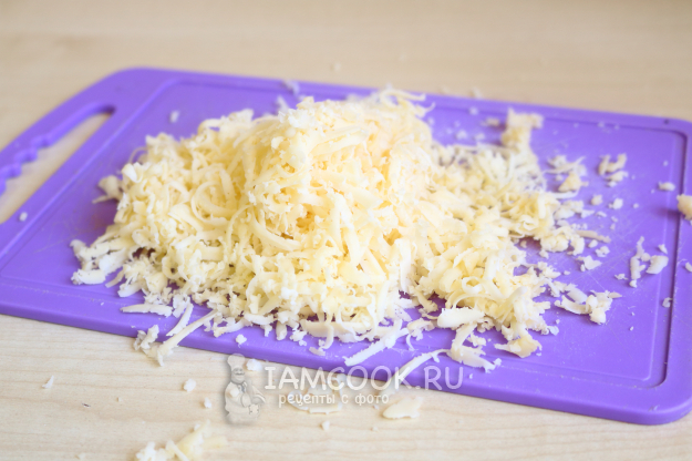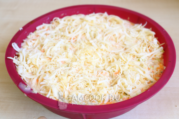 Разровняйте массу и посыпьте второй половиной тёртого сыра.