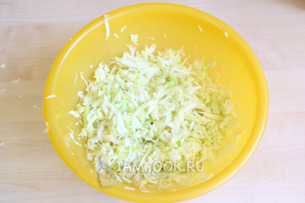 Капусту очистите от грязных листьев, удалите кочерыжку. Мелко нашинкуйте ножом или воспользуйтесь специальной тёркой. Выложите в удобную миску, всыпьте щепотку соли и помните руками пару минут до мягкости и выделения сока.