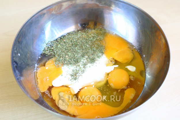 Для заливки в миске соедините яйца, сметану, щепотку соли и сушеную петрушку.
