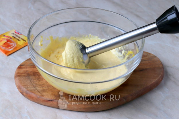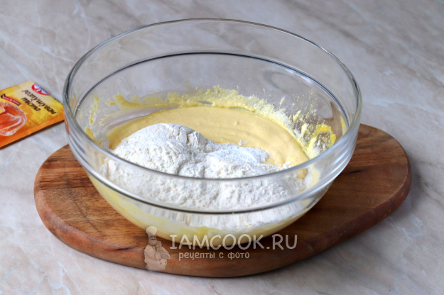 В творожную основу ввести частями просеянную пшеничную муку и разрыхлитель.