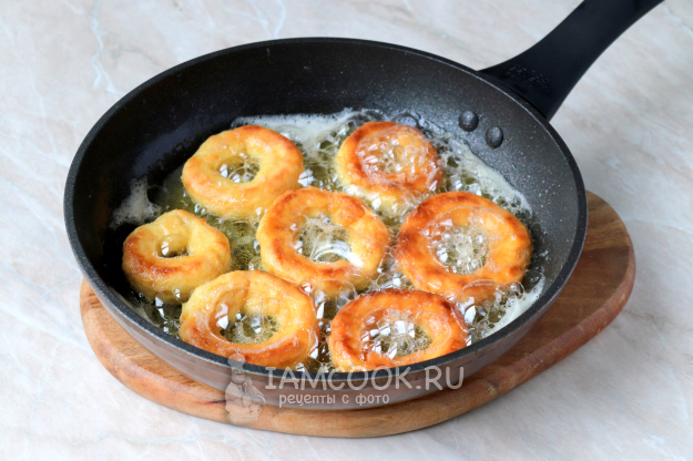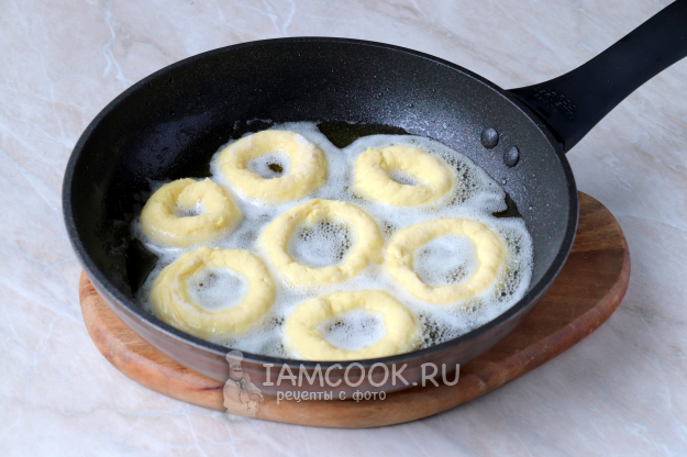 Разогреть сковороду с растительным маслом и выложить колечки.