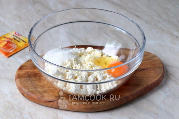 В глубокой миске соединить творог, сахарный песок и куриное яйцо.
