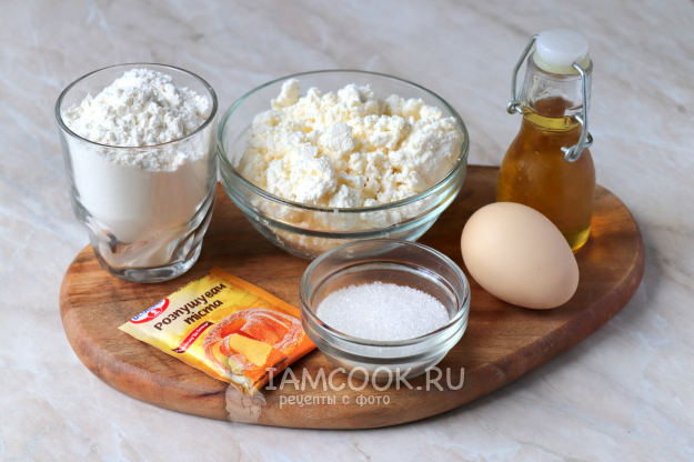 Возьмите все нужные продукты для приготовления калачей из творога на сковороде (в масле). Творог можно использовать абсолютно любой, у меня - 9%, от его влажности будет напрямую зависеть количество добавляемой муки, будьте готовы к тому, что её может понадобиться немного больше или меньше, нежели указано в списке.