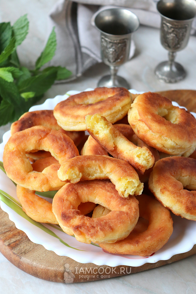 Разделить тесто на одинаковые кусочки небольшого размера, примерно по 15 граммов каждый. Рабочую поверхность посыпать мукой и раскатать из каждого кусочка теста длинный жгут. После чего соединить его края, сформировав своеобразное колечко (как на фото). Подобным образом подготовить все заготовки.