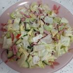 Колбасу нарезать мелкой соломкой и соединить с салатом.