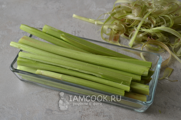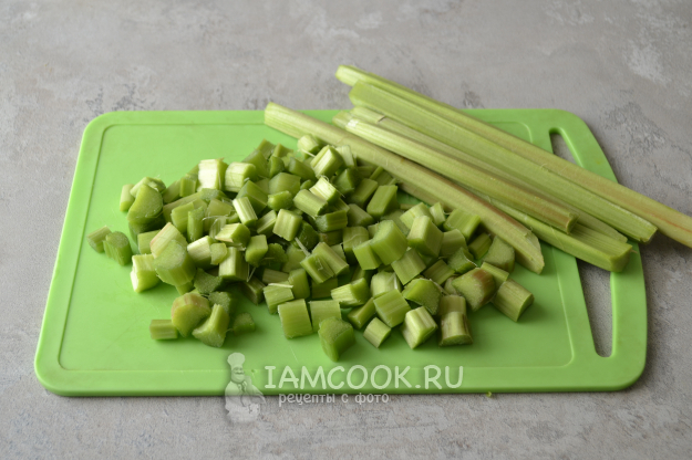 Черешки ревеня вымойте и отряхните от воды. Снимите при помощи ножа тонкую кожицу с каждого черешка.