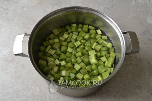 Сложите ревень в кастрюлю и залейте водой. Кастрюлю поставьте на огонь.