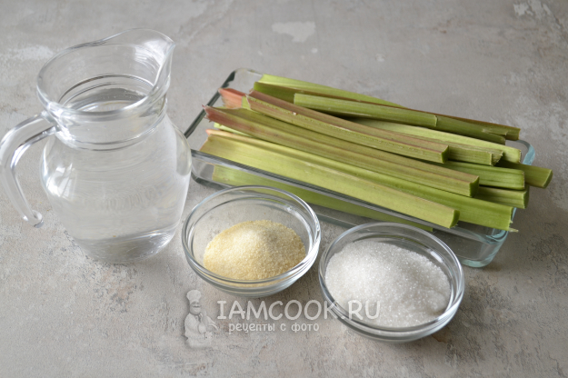 Возьмите необходимые продукты для приготовления желе из ревеня. В зависимости от того, какой плотности желе вы хотите, количество желатина может меняться в ту или другую сторону.