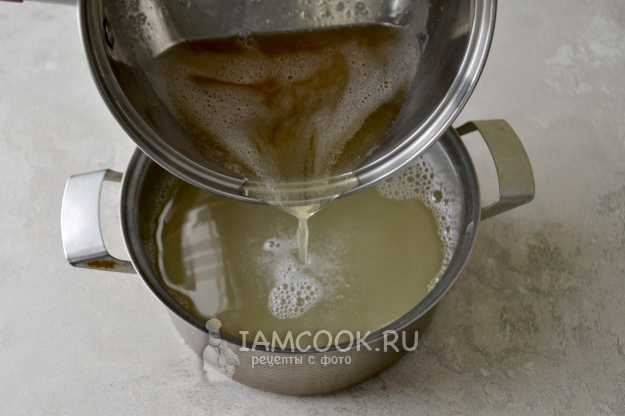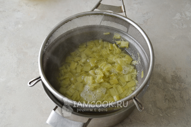 Затем процедите отвар через сито, отжав всю жидкость с кусочков ревеня.