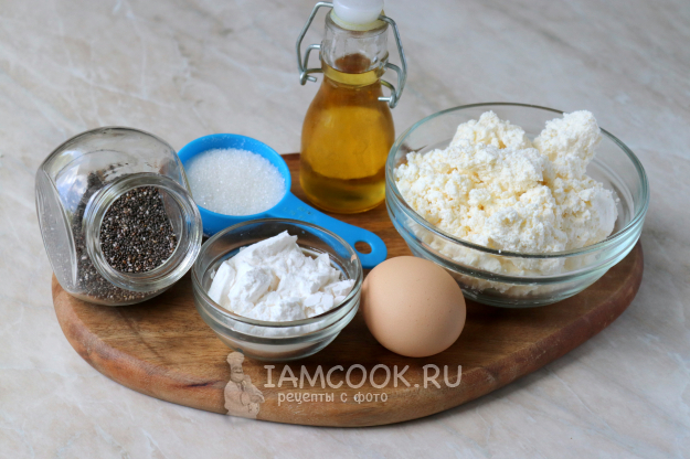 Возьмите указанные продукты для приготовления сырников с семенами чиа без муки.