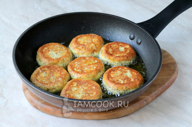 По истечению времени сформируйте из теста сырники одинакового размера. Чтобы тесто не прилипало к рукам, их нужно периодически смачивать холодной водой, тогда заготовки будут получаться гладкими и красивыми. Выложите сырники на разогретую с растительным маслом сковороду.