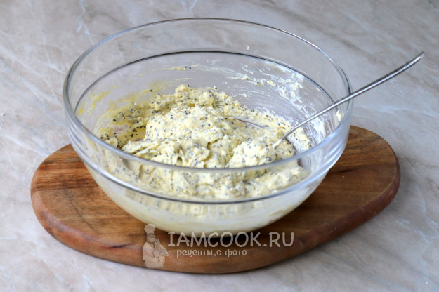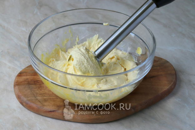 С помощью погружного блендера перетрите массу до однородного состояния. Если у вас нету блендера, просто разомните творог вилкой.