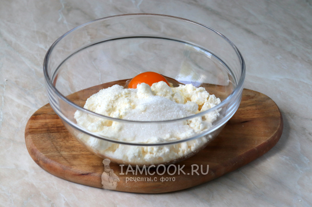 В глубокую миску переложите творог, куриное яйцо и сахар (вместо сахара можете использовать натуральный низкокалорийный заменитель, например стевию).
