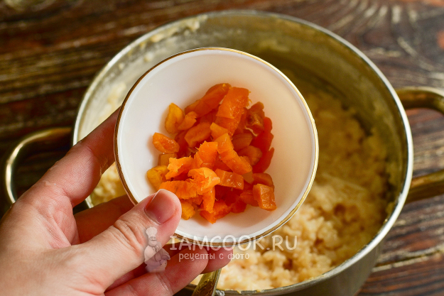 Туда же отправьте курагу, которую предварительно вымойте и нарежьте мелкими кубиками.