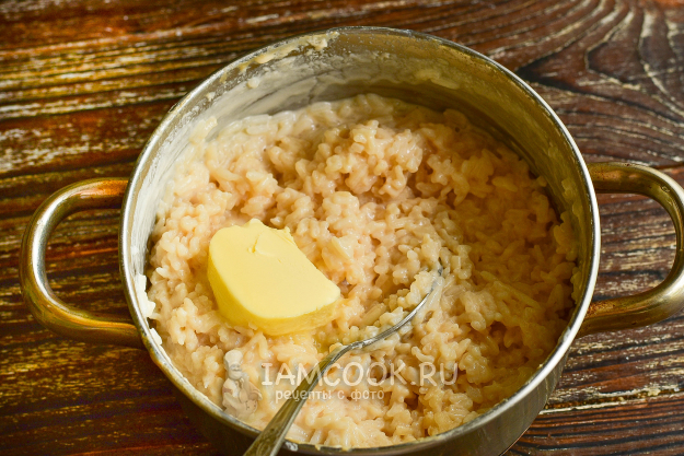 Когда молоко закипит, убавьте огонь и варите рисовую кашу на топленом молоке в течение 25 минут. Периодически ее мешайте ложкой, чтобы крупа не прилипла ко дну кастрюли. Затем укутайте кастрюлю полотенцем на 15 минут. В готовую кашу добавьте сливочное масло.