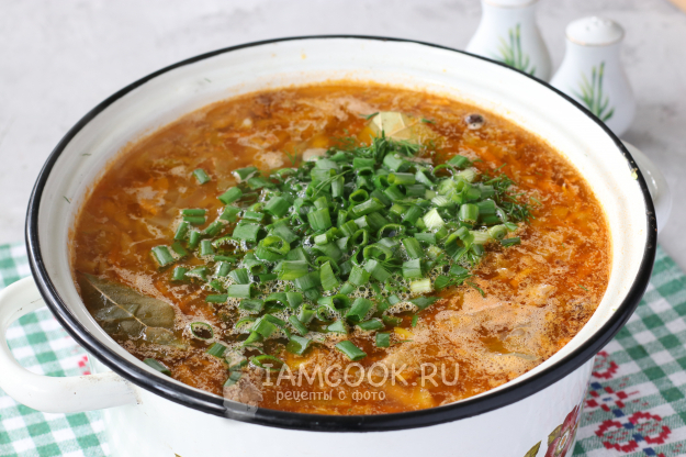 Готовым щам дать настояться 30-40 минут, хотя считается, что щи будут вкусней на следующий день. Разлить щи из свежей капусты с говяжьей тушенкой в тарелки, посыпать оставшейся зеленью, присыпать молотым перцем. Подать щи к столу.